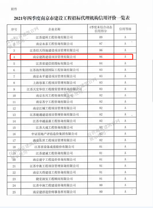 熱烈祝賀我司招標(biāo)代理在“2021年四季度南京市建設(shè)工程招標(biāo)代理機(jī)構(gòu)信用評價”中榮獲A級。