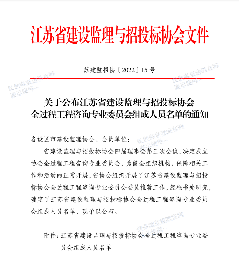 恭喜我司李慶傳同志入選“江蘇省建設監(jiān)理與招投標協(xié)會全過程工作咨詢專業(yè)委員會組成人員名單”