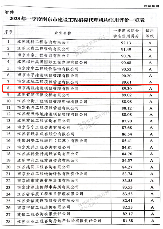 熱烈祝賀我司招標代理機構在2023年第一季度南京市建設工程招標代理機構信用評價綜合得分89.30分,全市排名第八名