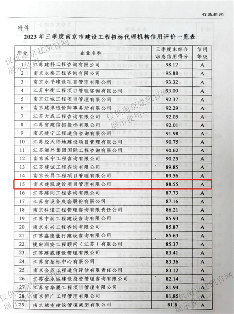 熱烈祝賀我司招標(biāo)代理機(jī)構(gòu)在“2023年三季度南京市建設(shè)工程招標(biāo)代理機(jī)構(gòu)信用評(píng)價(jià)等級(jí)A”