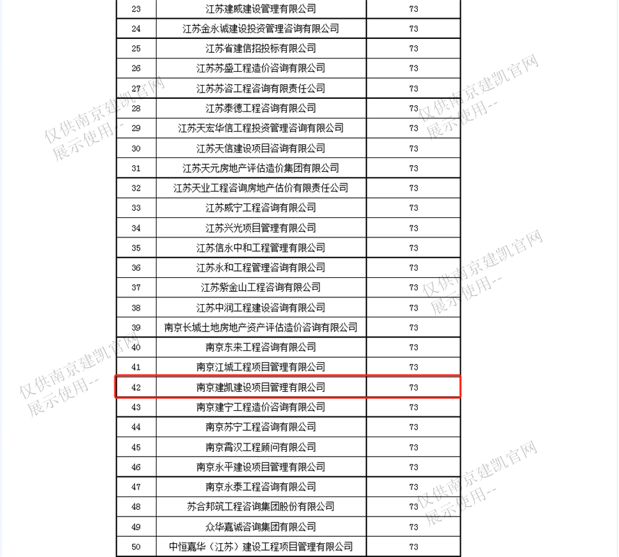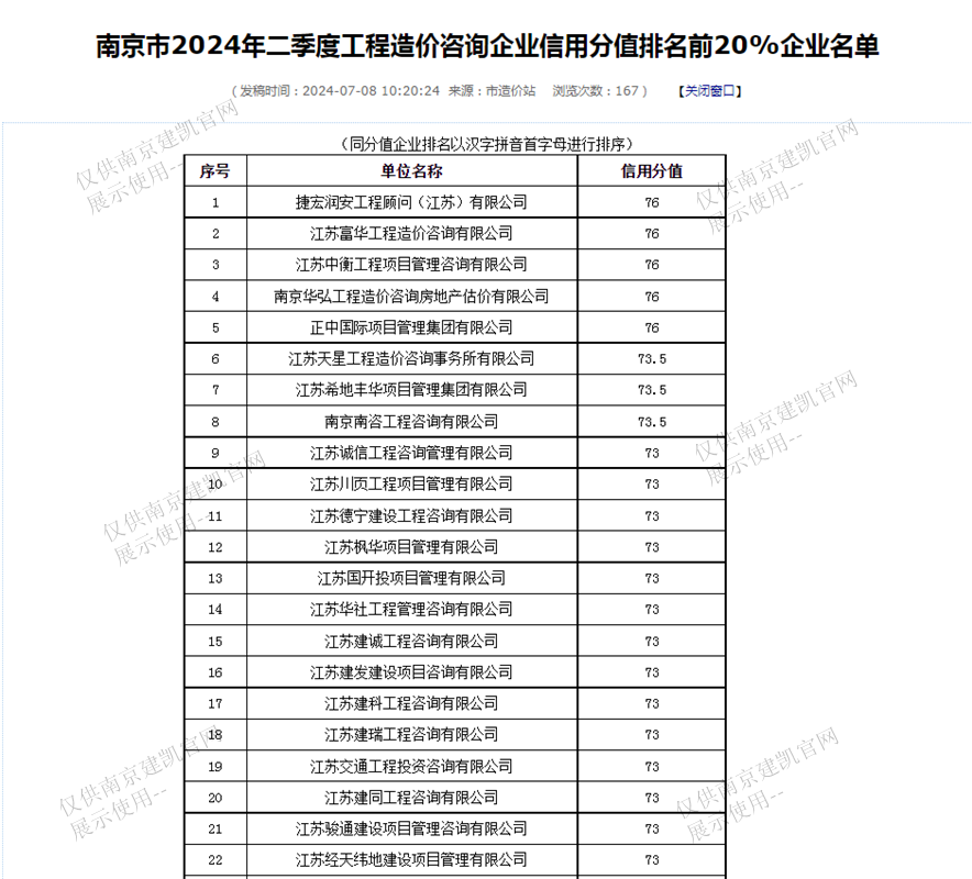 恭喜我司入選“南京市2024年二季度工程造價(jià)咨詢企業(yè)信用分值排名前20%企業(yè)名單”