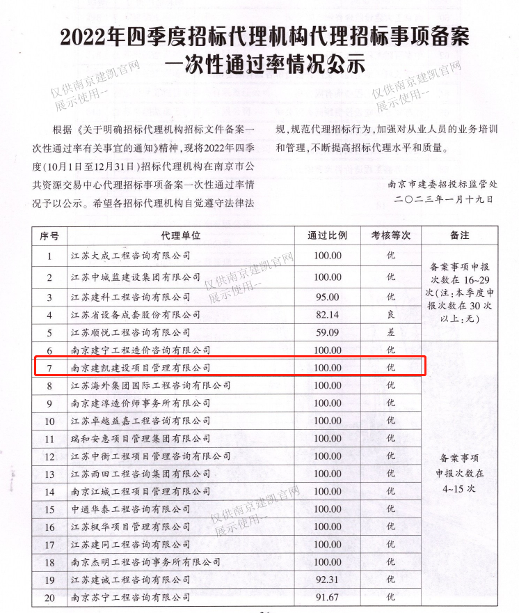 熱烈祝賀我司招標(biāo)代理機(jī)構(gòu)在2022年四季度招標(biāo)代理機(jī)構(gòu)代理招標(biāo)事項備案一次性通過率中獲得100%通過率,考核等次為優(yōu)。